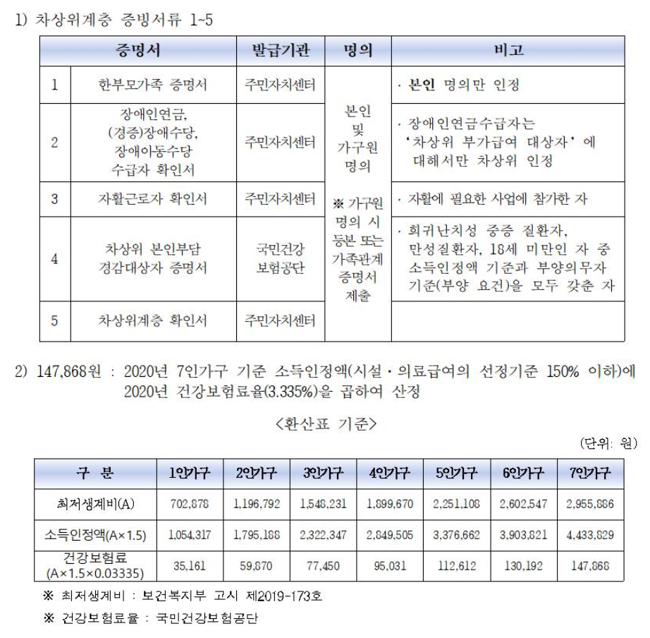 신청자격: 건강보험료가 최근 3개월 평균 7인 가구 기준 147,868원 미만인 자